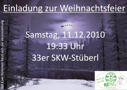 Liebe Fußballfreunde, das Jahr neigt sich dem Ende zu und Grund genug unseren Jahresausklang auf der Weihnachtsfeier in gemütlichem Rahmen zu begehen. Die Vereinsleitung lädt deshalb am Samstag 11.12.2010 ab 19:30 Uhr alle Funktionäre, Spieler, Gönner u. Helfer samt Begleitung zur Weihnachtsfeier im 33er Stüberl recht herzlich ein. Der Nachwuchs schließt das Jahr am Fr. 03.12.2010 ab 15 Uhr bei McDonald's Vorchdorf ab - herzlichen Dank für die Einladung. [Einladung vergrößern] Bildgalerie online: [Bildgalerie] |