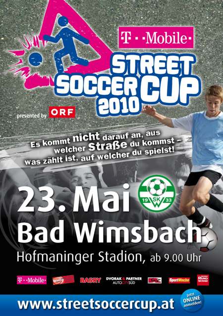 - T-Mobile Street Soccer Cup: Erstmals findet in Bad Wimsbach ein Vorrundenturnier zum österreichweit größten Fußballturnier statt – der Streetsoccercup. Wie der Cup schon heißt – gespielt wird auf der Straße, d.h. auf Asphalt. Vor den Toren des Hofmaninger-Stadion wird ein Street-Court aufgebaut – gespielt wird in 5 verschiedenen Altersklassen. |