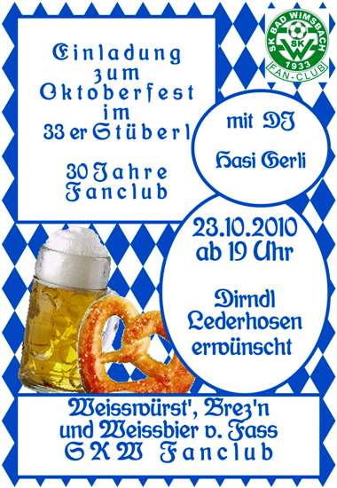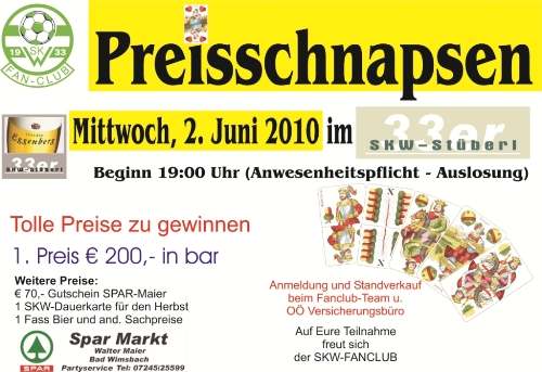 Preisschnapsen: Am MITTWOCH, 2. Juni lädt der SKW-Fanclub zum alljährlichen Preisschnapsen ins 33er Stüberl ein. Wie jedes Jahr gibt es schöne Preise beim spannenden Schnaps-Turnier. Anmeldungen bzw. Standverkauf beim Fanclub-Team u. im OÖ Versicherungsbüro am Marktplatz. Auf euer Kommen freut sich der Fanclub – der Erlös kommt dem Nachwuchs des SKW zugute. [Plakat vergrößern] |