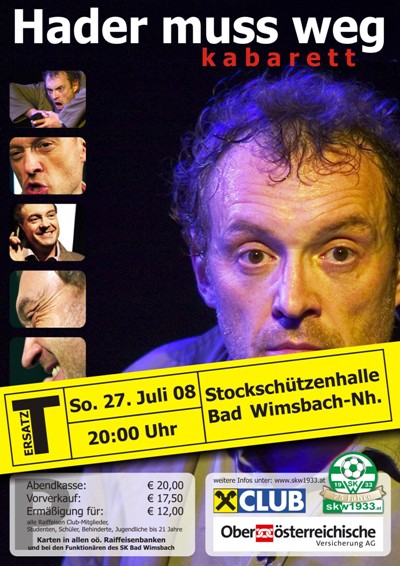 Im neuen Programm muss Hader also weg. Heißt das jetzt, er ist jemand, der weg gehört? Also quasi: Unwertes Leben? Oder muss er nur kurz weg und kommt gleich wieder? Oder muss er weg aus seinem neuen Programm, weil ihn andere Figuren hinausschmeißen? Wird Hader überhaupt anwesend sein? Muss. er irgendwann an diesem Abend sterben? Und. ist er dann für immer weg? Und wer ist dann auf der Bühne? . Josef. Hader:" In dem Programm kommen vor: Eine nachtschwarze Vorstadtstraße voller Gebrauchtwagenhändler, eine. heruntergekommen Tankstelle, ein grindiges Lokal, ein Kuvert mit 10.000 Euro, eine Schusswaffe und ca. sieben verpfuschte Leben. Nicht vorkommen werden Prominente und Bundeskanzler. Es wird also wieder total unpolitisch." |