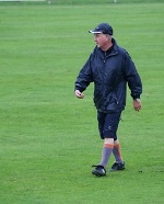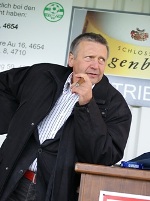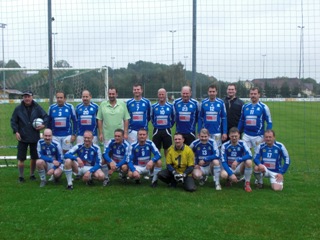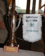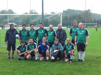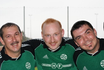 Rasen des Hofmaninger-Stadions Schiedsrichter Dr. Franz Hofmaninger, GF Manfred Hiesl und GFHerbert Stelzer (HF Industriemontagen) und Manager GF Grundwald Harfmann (Metallwaren Hofmaninger) |