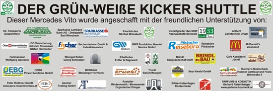2010 geliefert werden. Federführend dabei waren die Firma Int. Transporte Gasperlmayr, die Sparkasse Lambach, der Fanclub des SKW und die Mitglieder des Nachwuchsförderpools. Dazu kam noch zahlreiche Hilfe von unseren Partnern im grün-weißen Wirtschaftspool: OÖ Versicherung Rosenauer & Hochreiter, Wirtshaus Staudinger, Heilmassuer Wolfgang Gerecnik, Weingut Köllan Georg Schmelzer, Seyr Harald GmbH, GWS Salzburg, Brindl BaugmbH, Eibelhuber Sägewerk, Reisebüro Pilsbacher, Peter Roithner GmbH, OEBG Power Solutions GmbH, Asamer Trading GmbH, fischer-technic GmbH & Industrieservice, Artdent Unger, Blitzschutzanlagen Kontschieder, Rindenmulch Austaller Friedrich, freedance Huemer Ingrid, Cafe Konditorei Jöchtl, Parfums Kosmetik Gerhard Reisenberger und McDonald's Vorchdorf. „Kicker Shuttle“ – ab sofort reisen unsere Youngsters in einem neuen Mercedes Benz Vito Eco Bus, der den neuesten technischen Standards entspricht: u.a. mit 116 starken Diesel PS, ABS, ESP, Airbags usw. - Liefertermin wird Ende des Jahres sein. Der Bedarf für dieses Fahrzeug ist gerade durch den anstehenden Neubau der Wimsbacher Volksschule noch mehr gegeben, da voraussichtlich ab Februar 2010 in Turnhallen in den Nachbarorten ausgewichen werden muss. Der mittlerweile schon in die Jahre gekommen Fanclub-Bus wird weiterhin noch in Verwendung bleiben - solange es weiter so gut läuft sind wir froh, dass wir zwei Fahrzeuge für die bevorstehenden zahlreichen Fahrten haben. |